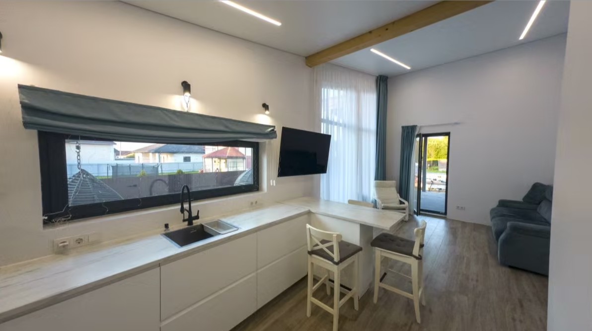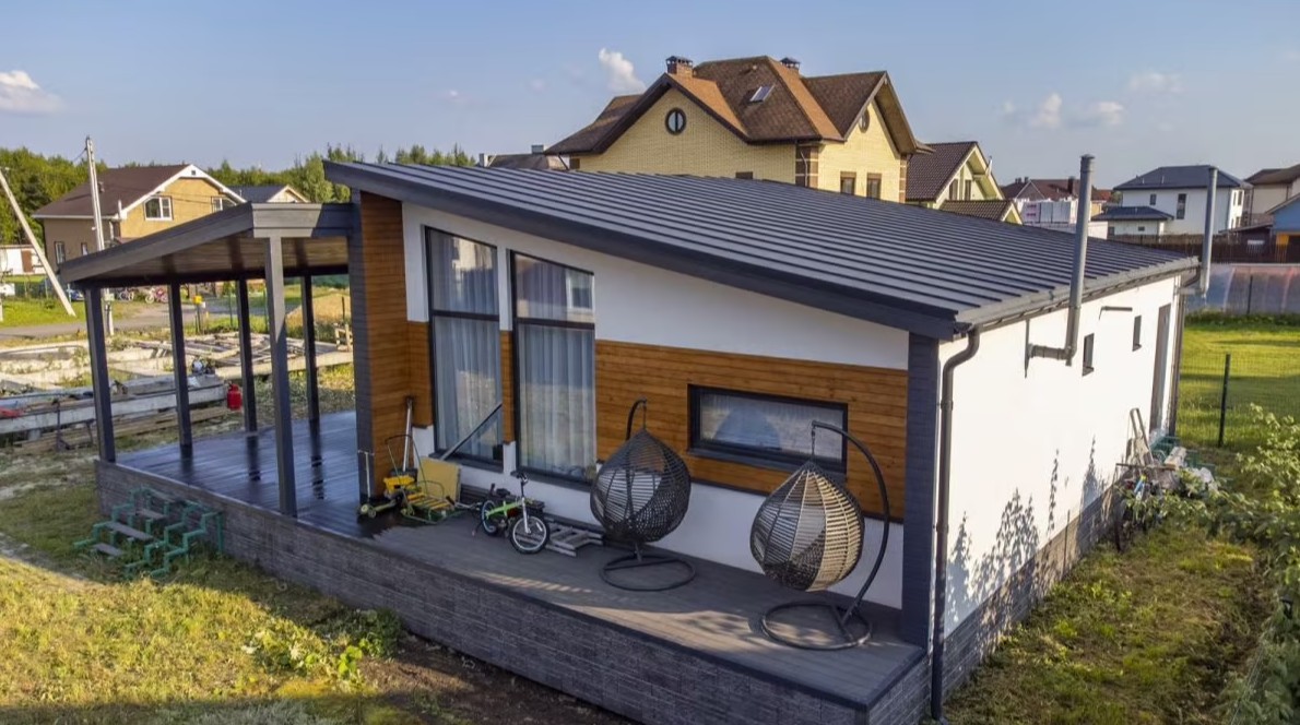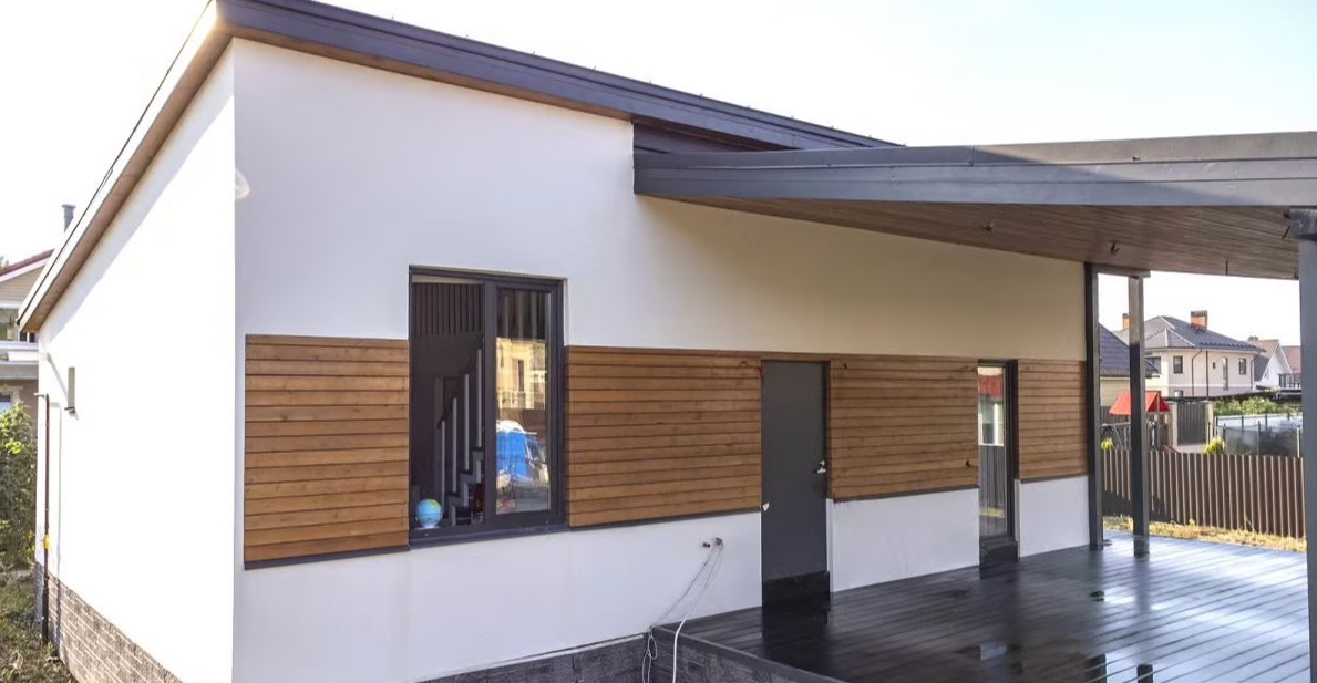Стильный дом 115 кв.м в современной дизайне. Отделка фасада штукатуркой и деревом. Большая летняя терраса с навесом, внутренняя отделка под ключ.
