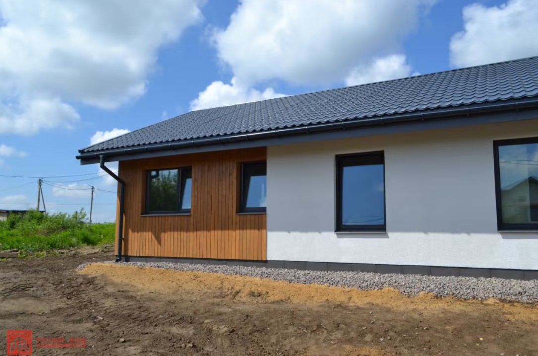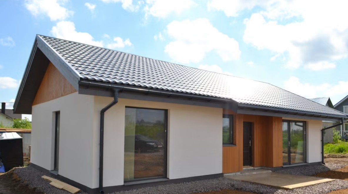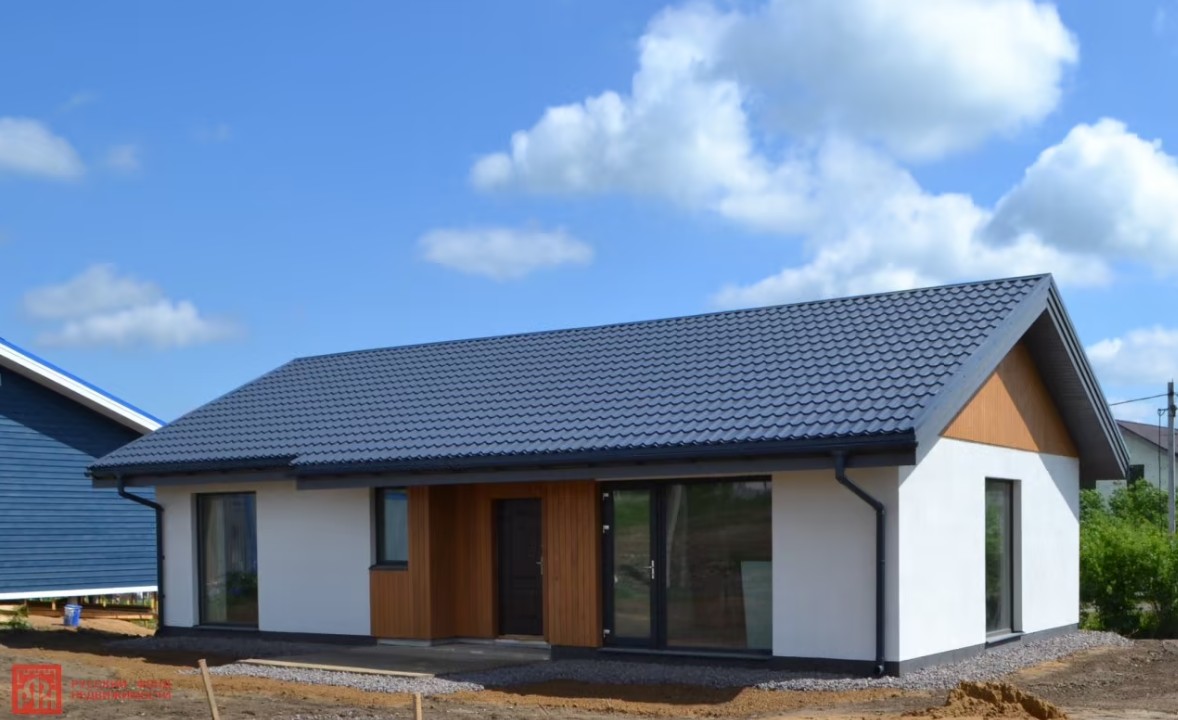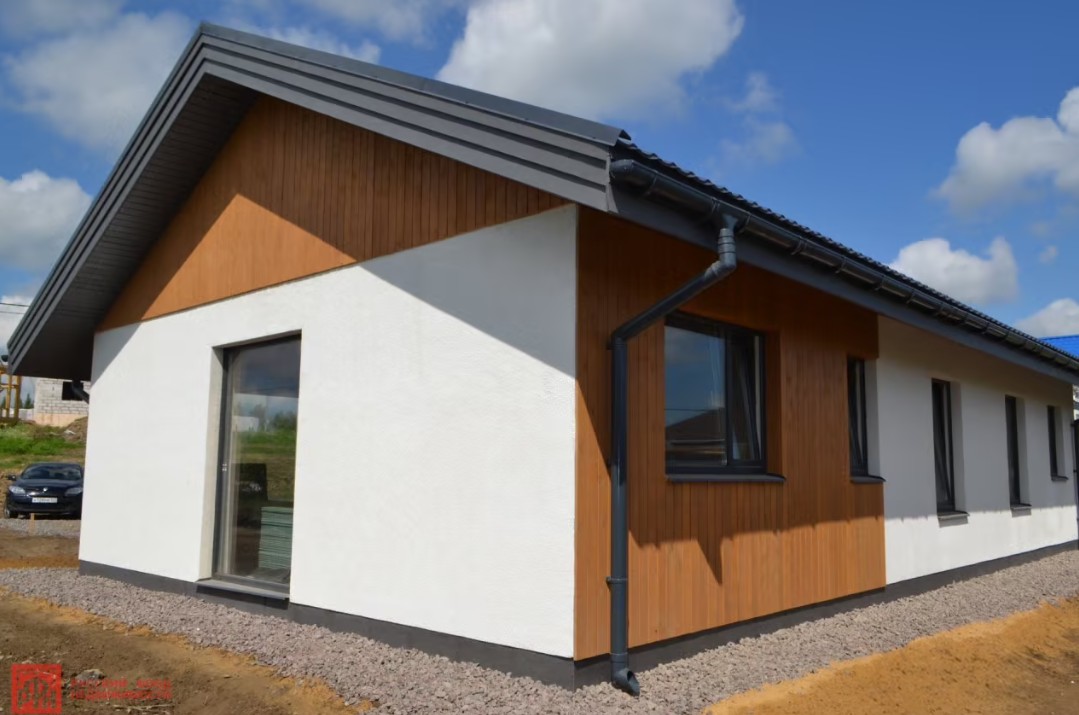 Каменный дом в Ленинградской области с панорамным остеклением. Отделка фасада в скандинавском стиле: штукатурка+дерево. 3 спальни и кухня-гостиная. Выполнены все работы под ключ, подведены коммуникации. Ленточный фундамент.